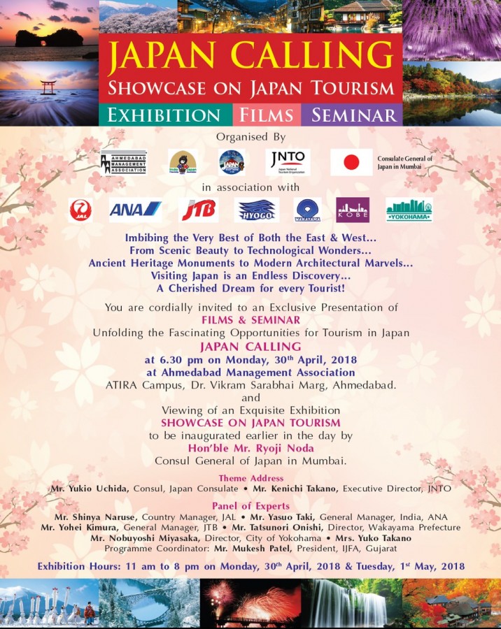 « All Events This event has passed. JAPAN CALLING – Showcase on Japan Tourism – Exhibition – Films – Seminar April 30, 2018 @ 11:00 am - May 1, 2018 @ 8:00 pm UTC+5.5 « Japan-India Friendship: Activities of JICA in India Experiences of Japanese Business in India – Some Points to Ponder » You do not have permission to view this form. Add to calendar Google Calendar iCalendar Outlook 365 Outlook Live Details Start: April 30, 2018 @ 11:00 am UTC+5.5 End: May 1, 2018 @ 8:00 pm UTC+5.5 Event Categories: Business Seminar, Exhibition, Movie Organizer Venue Formidable Style
